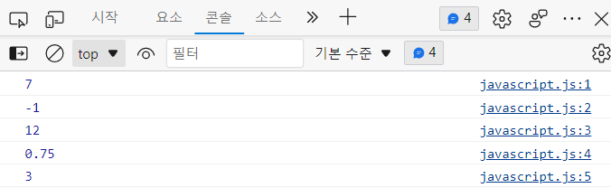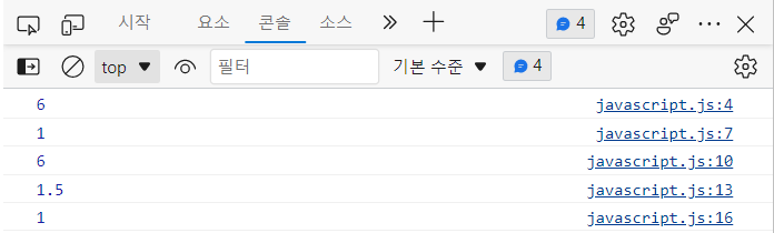 | 나누기 | / | 1 / 2 -> 0.5를 반환 |