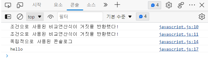 console.log("조건으로 사용된 비교연산식이 거짓을 반환했다!")