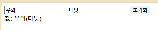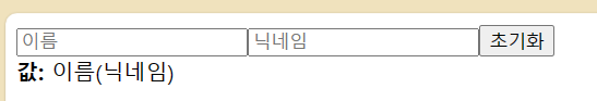 ➡️두 개의 input이 존재하고, 이름과 닉네임을 입력하면 이름(닉네임)이라는 형식으로 출력이 되도록 구현하기.