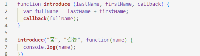 introduce 함수를 실행하면, callback 자리를 새로운 함수 function(name)으로 지정해주면서 fullName에 저장된 이름이 callback(fullName) 함수의 인자로 들어가서 실행된다.