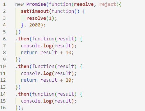 - 첫 번째 .then()에서 이행된 결과 값 1을 받아서 10을 더한 후 다음 .then()으로 넘겨준다.